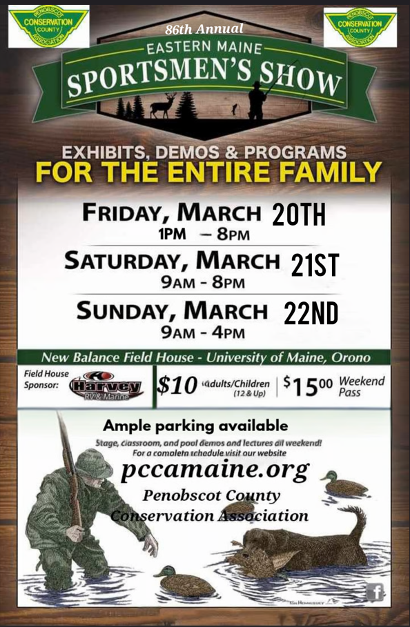 The Penobscot County Conservation Association produces this show every March, an annual rite of spring for Sportsmen and Sportswomen in Eastern Maine and beyond for more than 80 years, featuring Vendors, Exhibitors, and Educational Seminars.